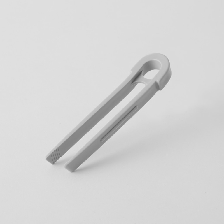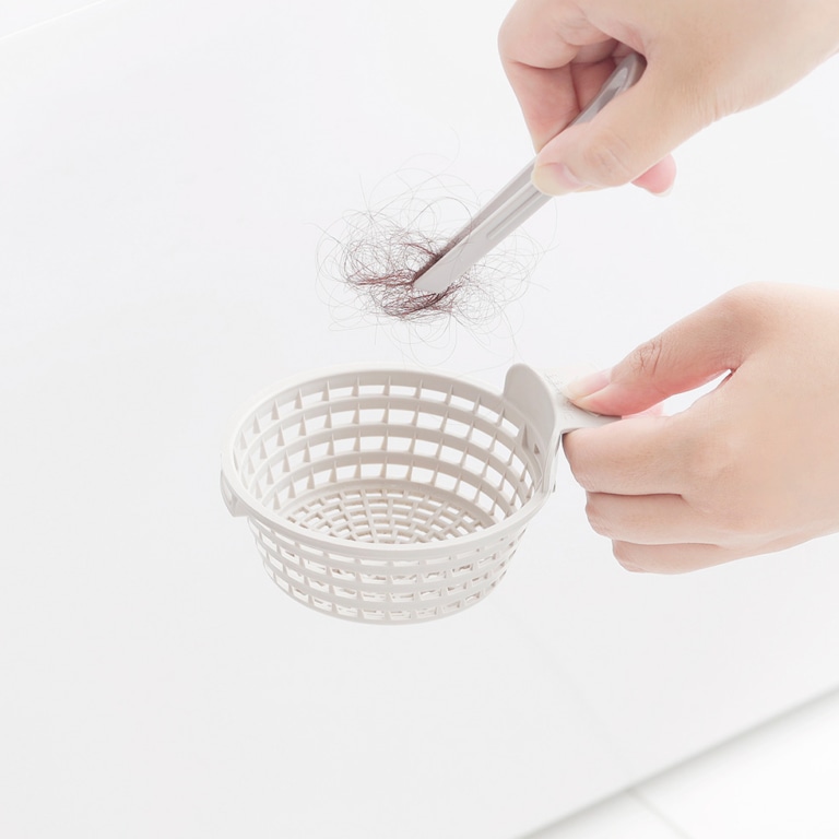 手で触れたくない排水口まわりの髪の毛やゴミがとれるピンセット付き。先端が斜めでつかみやすくなっています。