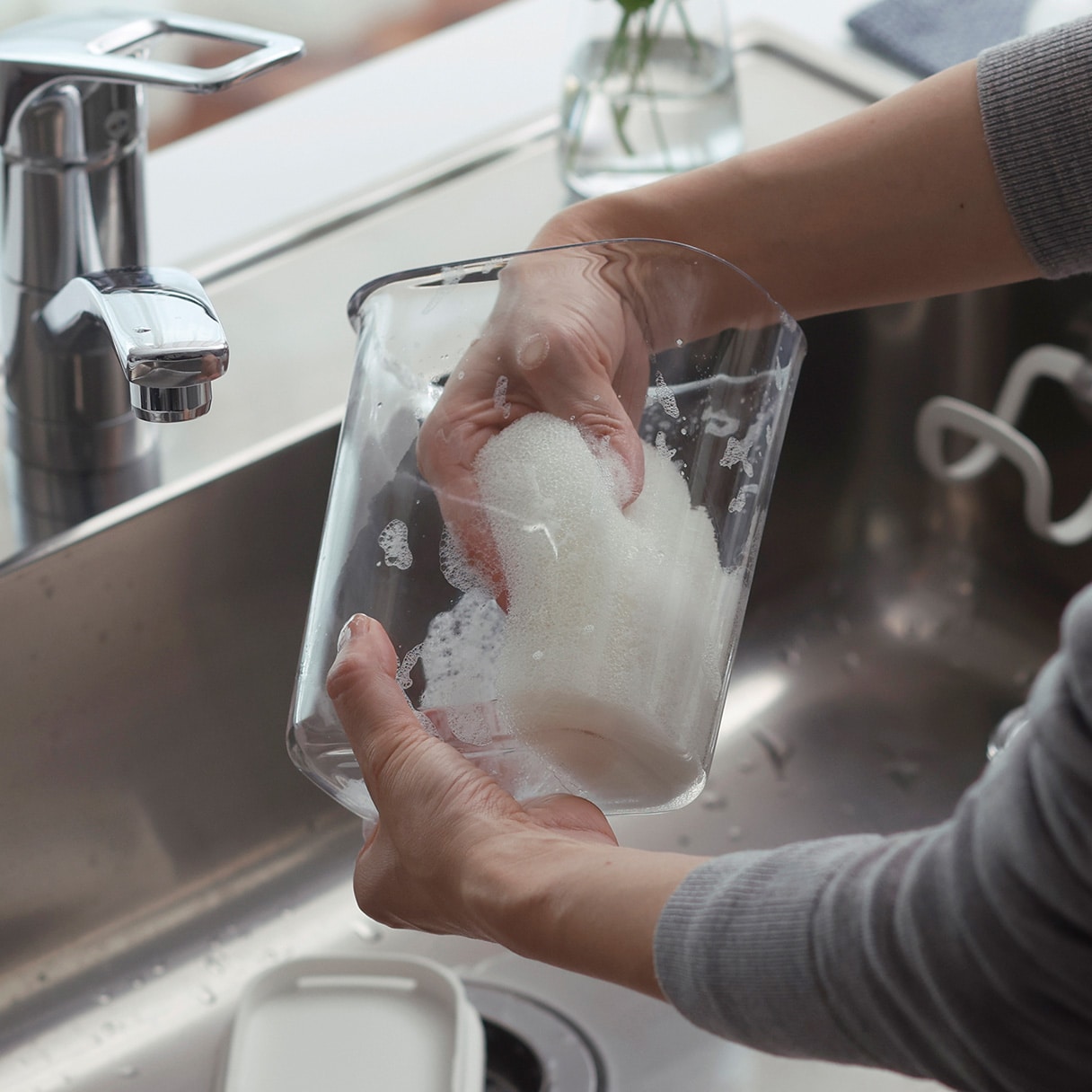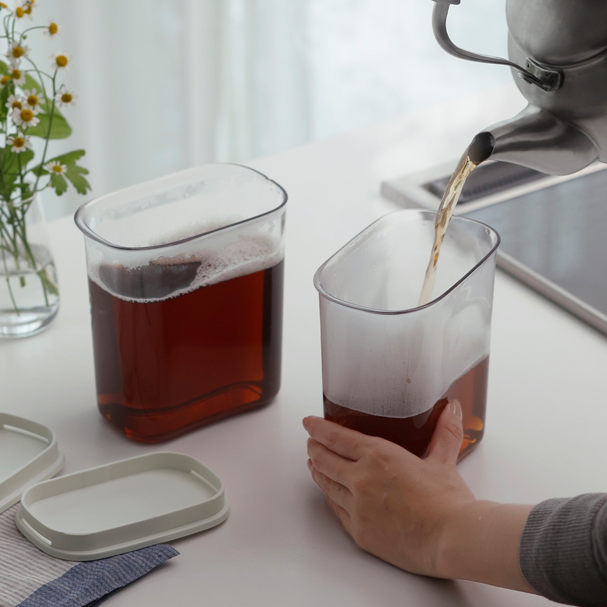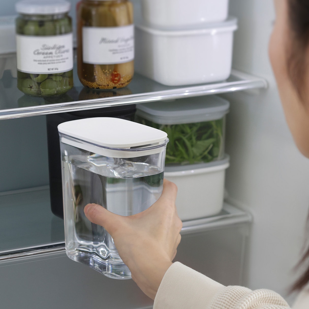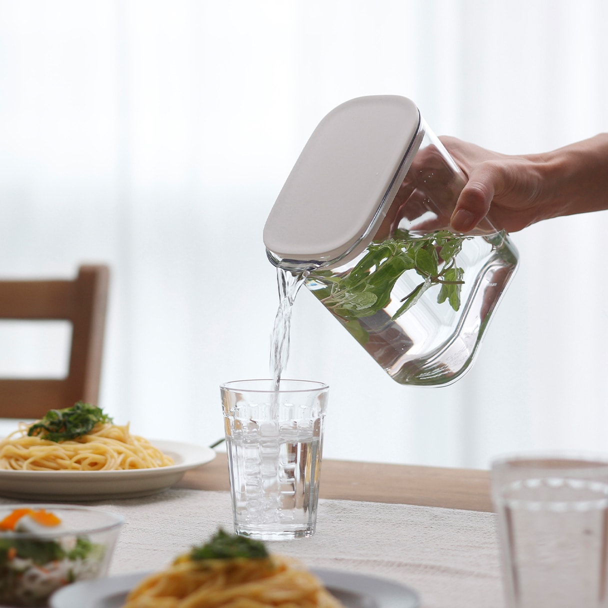 冷蔵庫の隙間に入る冷水筒です。棚にも扉の前ポケットにも入るコンパクトサイズ。注ぎ口は水切れがよく、パッキンのないフタと本体の2パーツでお手入れも簡単です。飲み物を入れて、冷やして、飲んで、洗う。冷水筒のすべてのサイクルをスムーズにします。