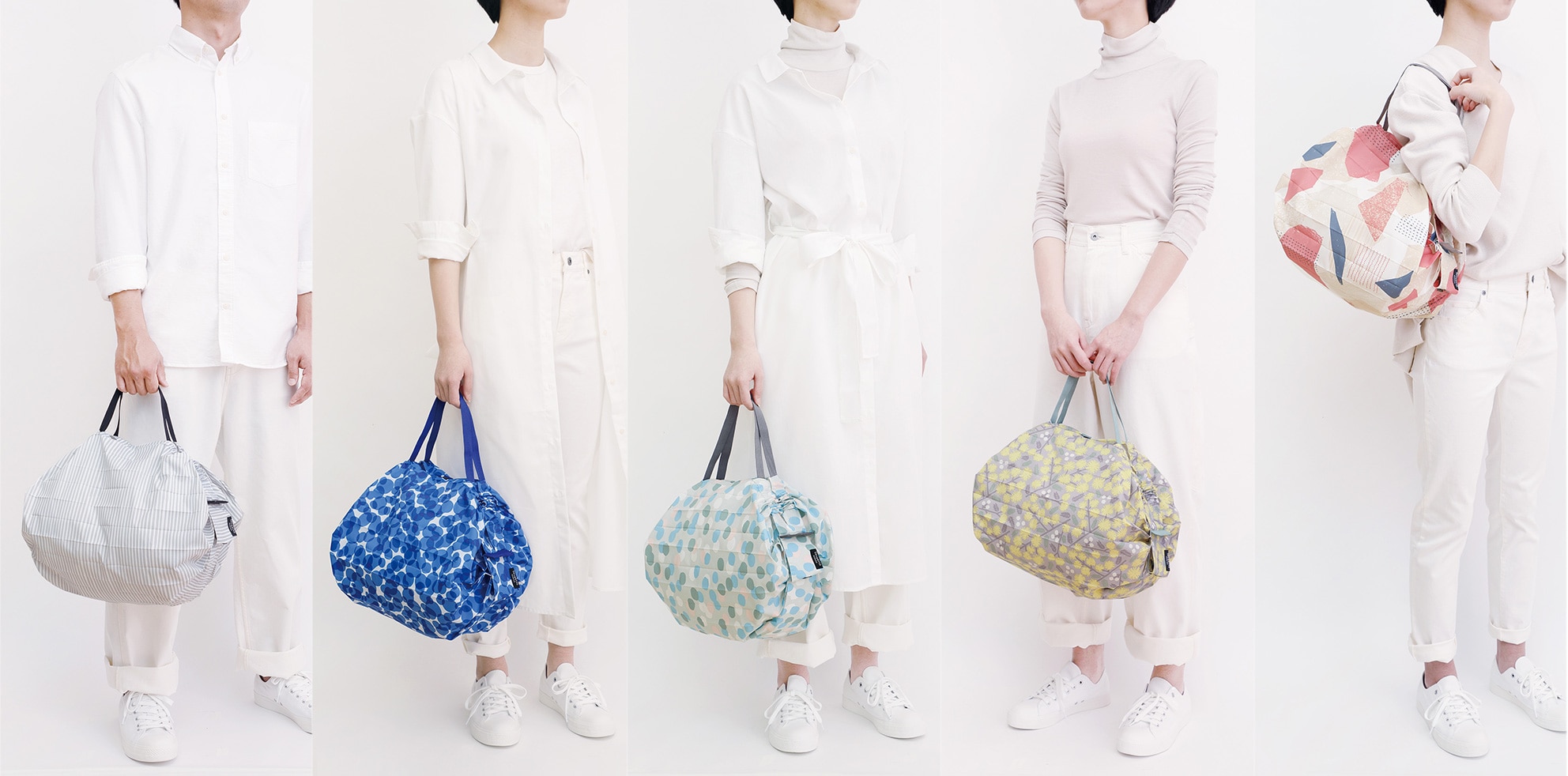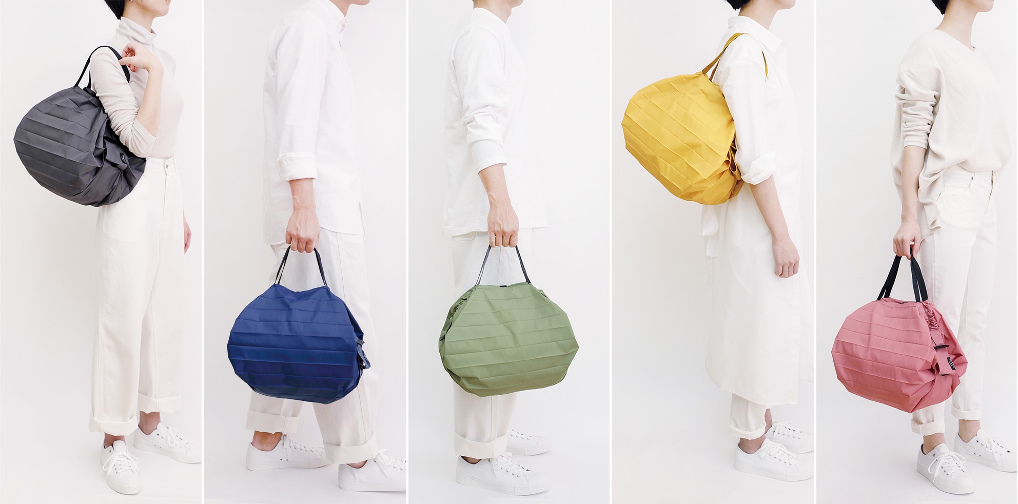 両端を引っ張るだけで一気にたためるバッグに、4つの新カラーが仲間入りしました。Mサイズは、どんなシーンにも使いやすい程よい大きさ。毎日のお買い物や、荷物が増えたときのサブバッグにおすすめです。