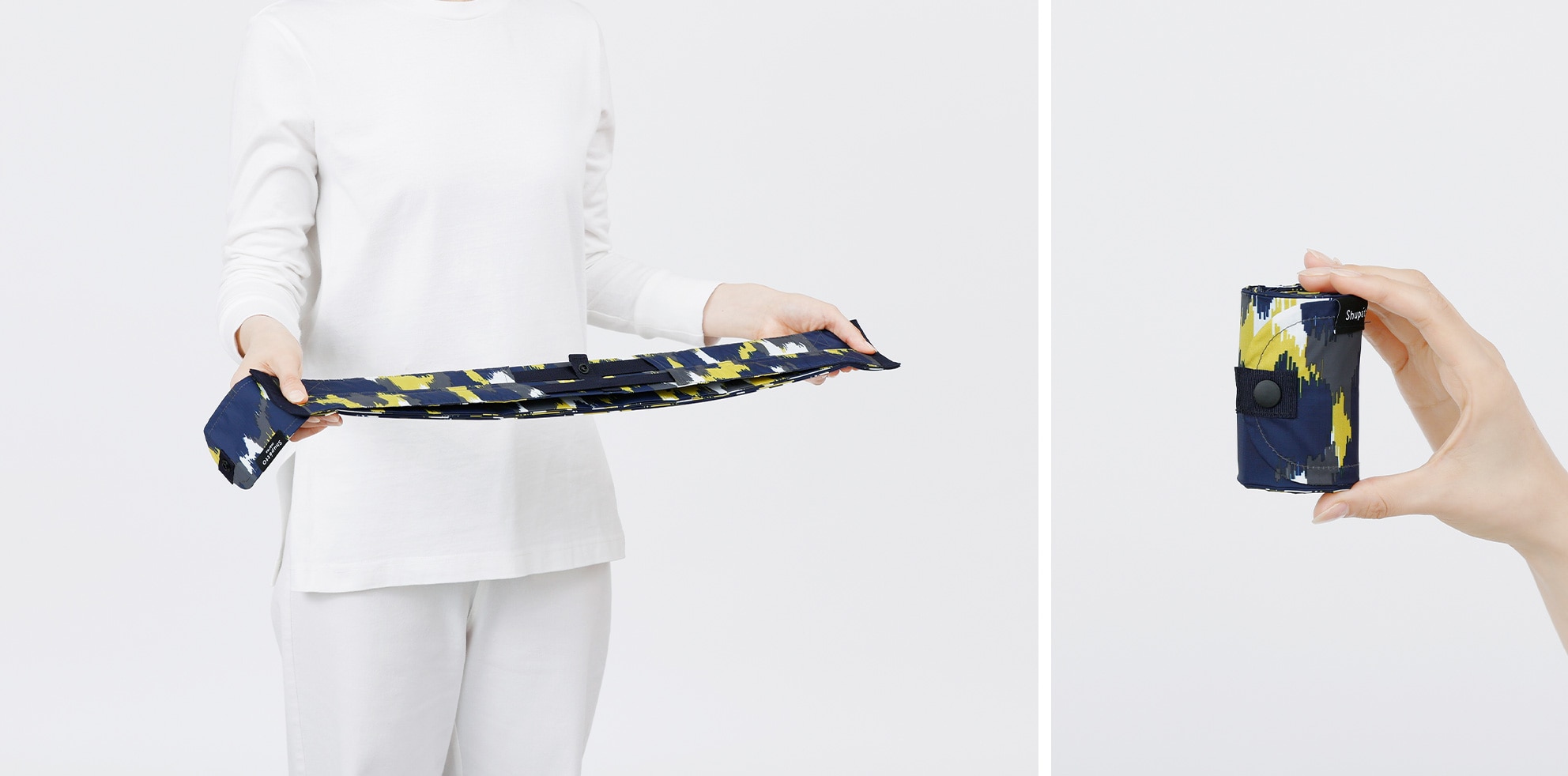 両端を引っぱると一気に帯状に。あとは2回半分に折って丸めるだけでたためます。