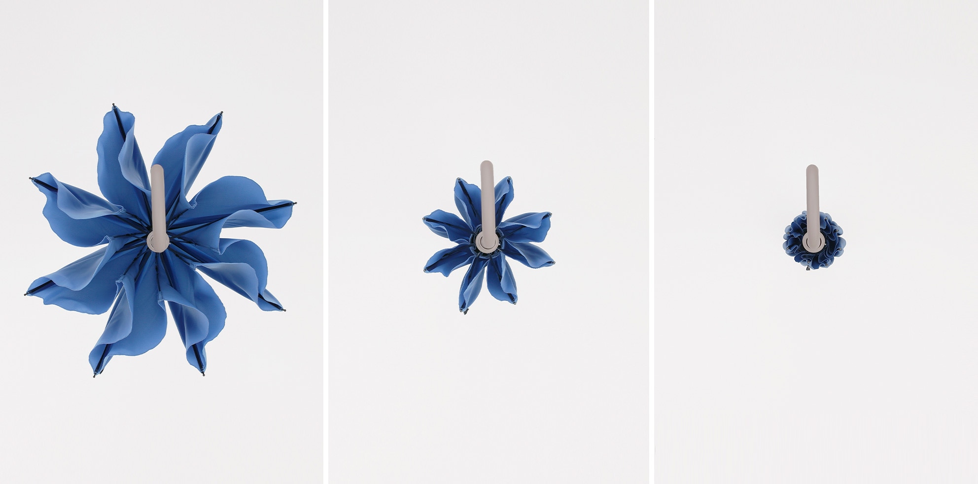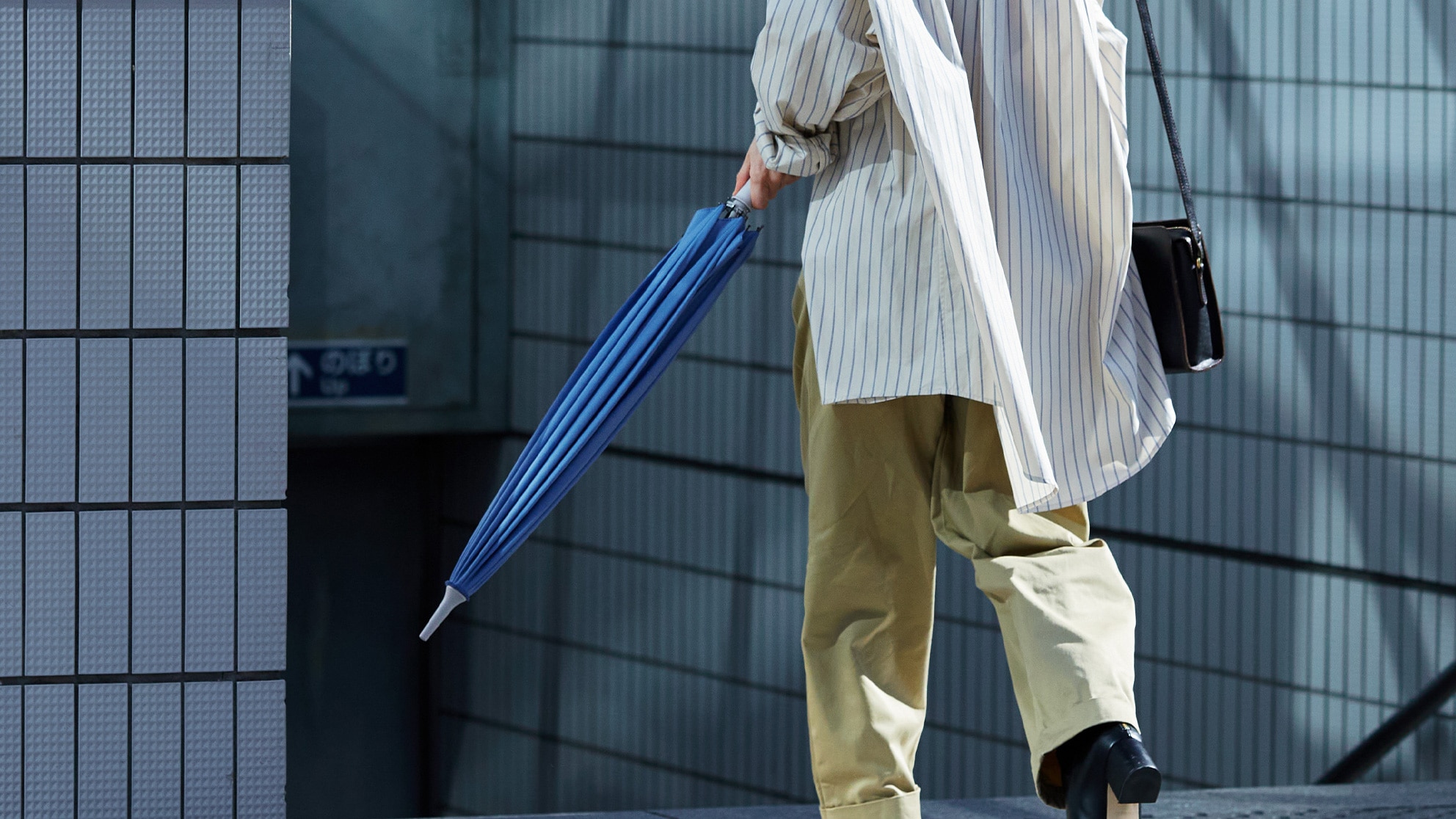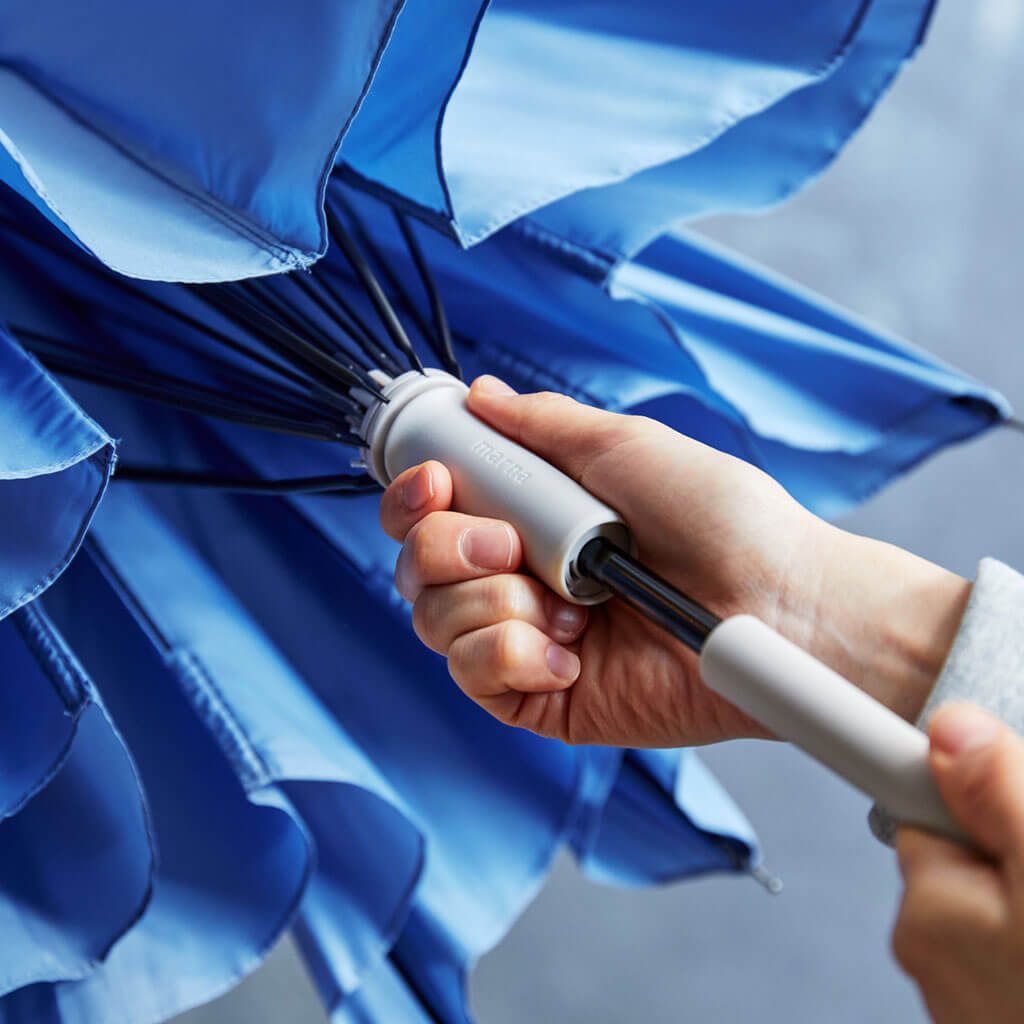 ベルトで留める必要がない、閉じるだけで一気にたためる傘です。62cmサイズに、6つのニュアンスカラーが仲間入りしました。閉じる動きに連動して、生地がくるくると巻き込まれる新機構。雨粒の付いた生地に触れずにたためるので、最後まで手が濡れません。