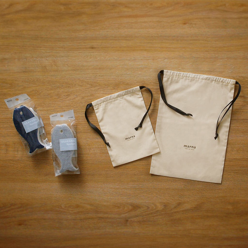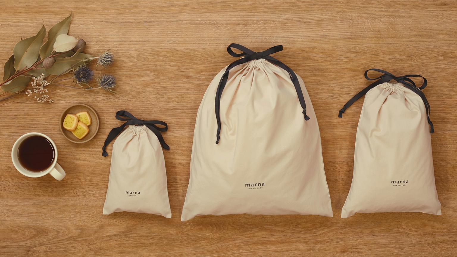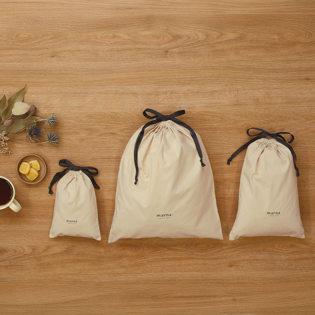 マーナ公式サイト限定のオリジナルコットンバッグです。ご自身で商品を組み合わせたり、メッセージカードを入れたり、お好みに合わせてラッピングしたい方におすすめです。巾着タイプなので、リボンをキュッとしめて簡単にお包みいただけます。