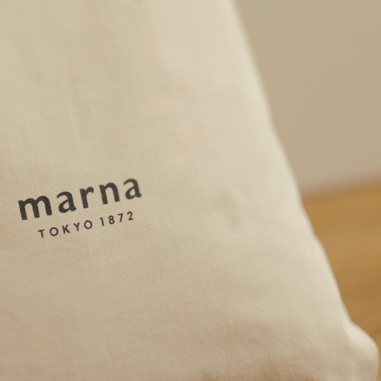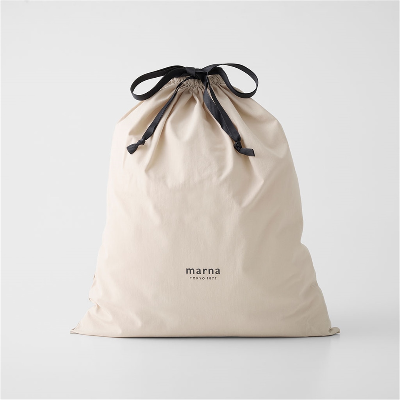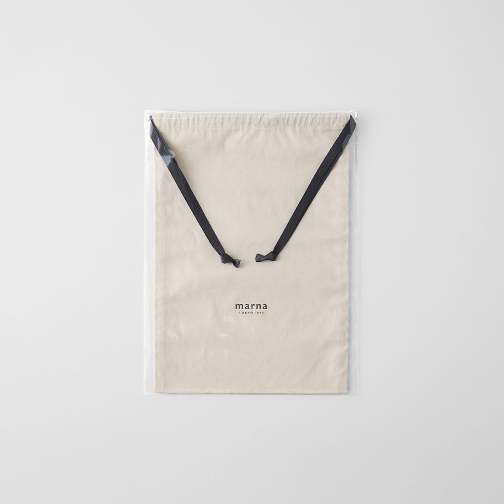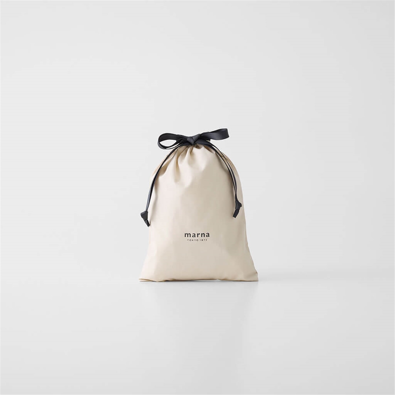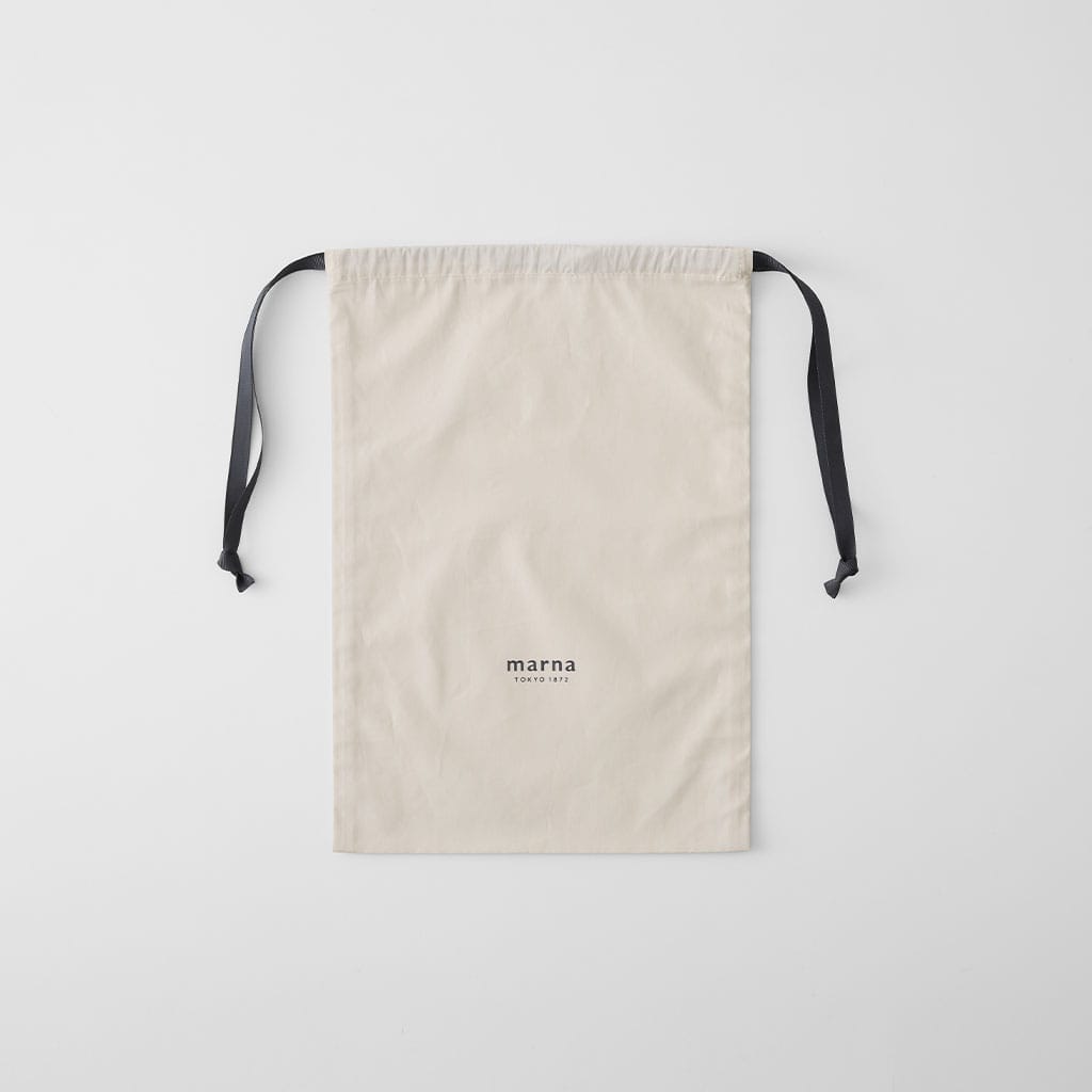 あたたかみのある生成りのコットンバッグに、ダークグレーのリボンを合わせ、小さくマーナロゴをあしらいました。小物入れなどの普段使いにも。