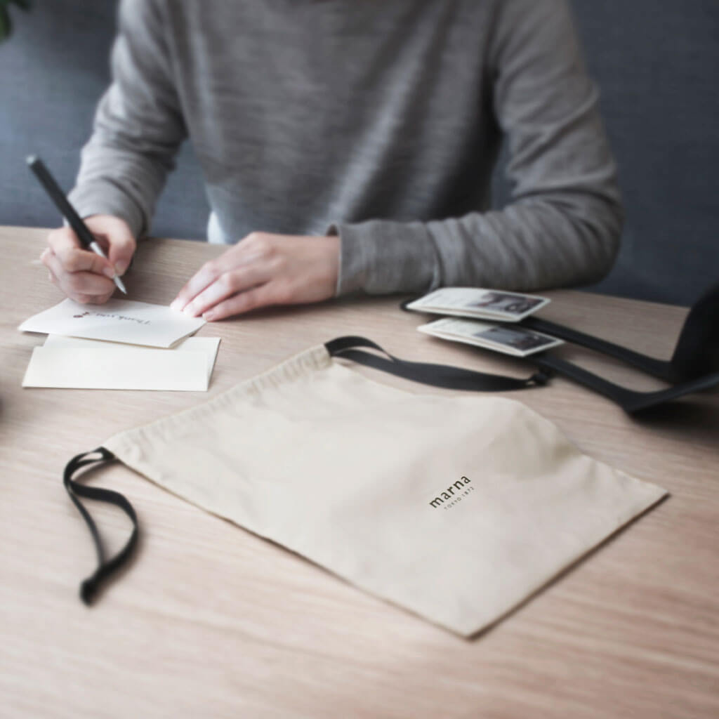 マーナ公式サイト限定のオリジナルコットンバッグです。たたんだ状態でお届けします。巾着タイプなので、リボンをキュッとしめて簡単にお包みいただけます。