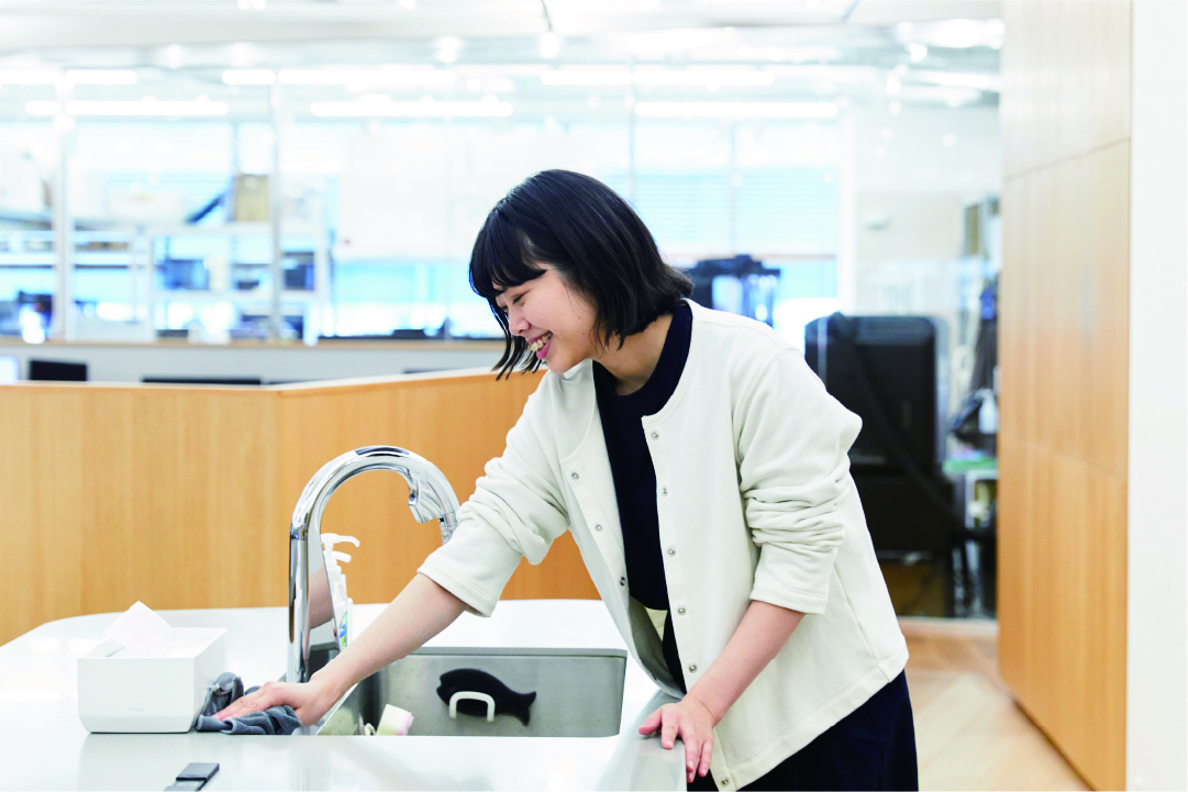 また、毎朝全社員で15分間掃除を行うこともマーナらしさのひとつです。自分たちの場所を自分たちで整える姿勢がものづくりの精神につながり、日々の開発にも生かされています。
