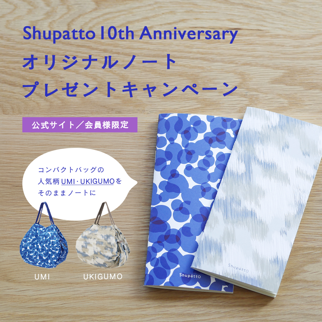 マーナ公式サイト会員様限定、Shupattoバッグを含む税込¥3,300以上ご購入いただいたお客様に、Shupatto10周年オリジナルノートをプレゼントいたします。Shupattoバッグの人気柄、UMIとUKIGUMOが小さなノートになりました。お買い物メモやレシピ、旅行の思い出を残す時など、ちょっとしたタイミングで気軽にお使いいただけます。
