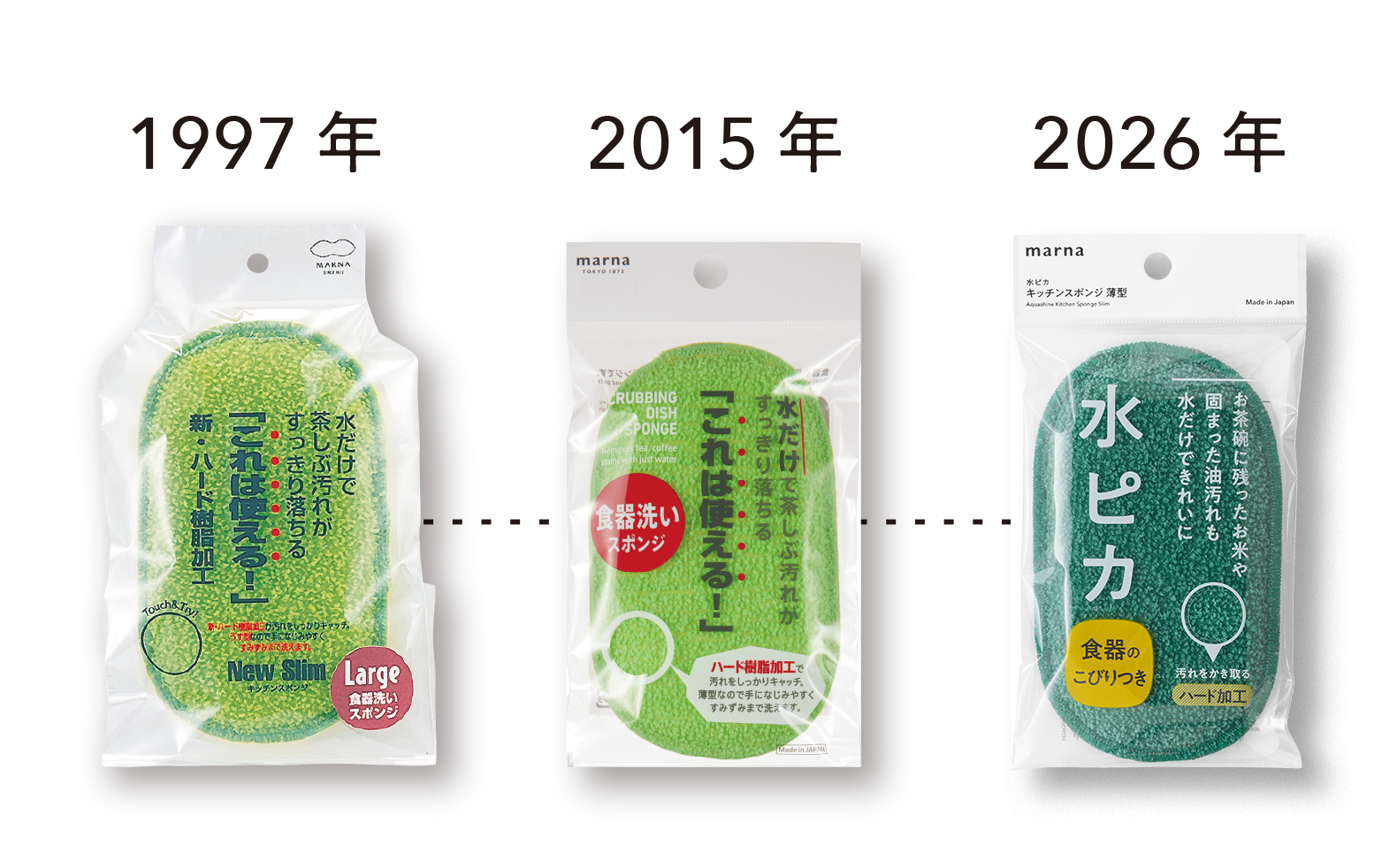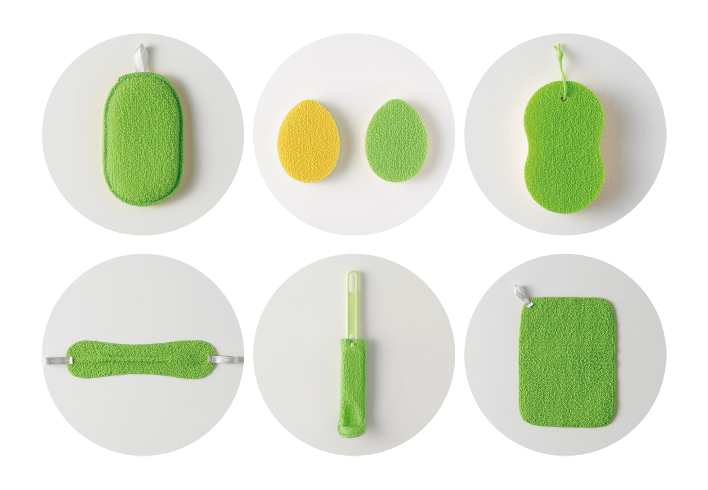 はじめに開発されたのは、食器洗い用の「キッチンスポンジ」と「茶渋おとし」、浴室用の掃除アイテムへと展開した「水垢取りスポンジ」と、場所と問わず使えるクロスタイプの「水垢取りダスター」の4アイテムです。その後、ハード加工の力が発揮できる、蛇口まわり専門、ボトル洗いへと広がっていきました。今回のリニューアルでは従来の形状や使い心地、カラーも見直し、現代の暮らしや掃除習慣に合わせて一部のアイテムが新しい姿へと生まれ変わっています。
